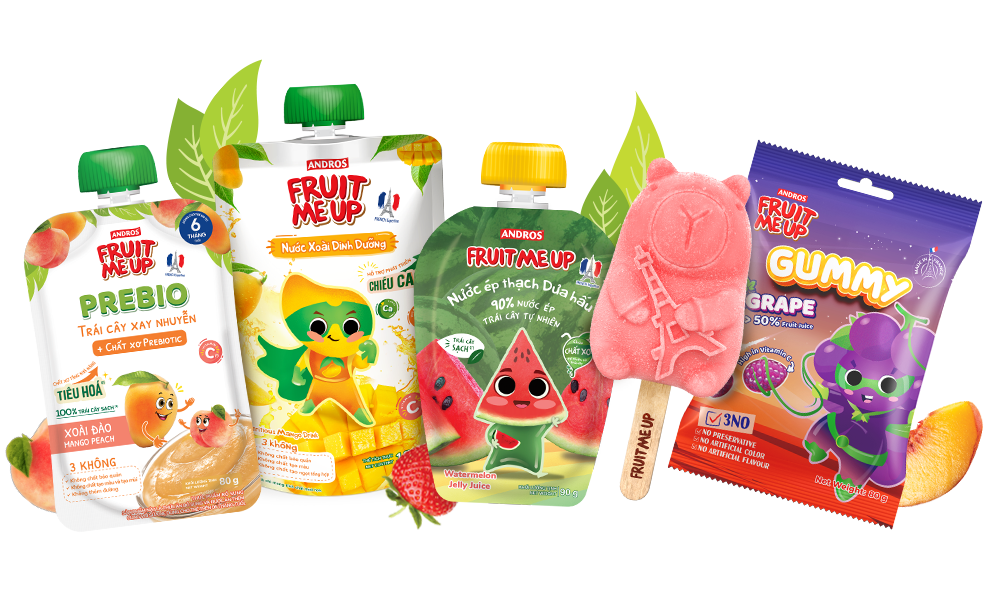 Fruit Me Up được sản xuất bởi Andros – là tập đoàn đa quốc gia của Pháp, với những giá trị đáng tự hào hơn 100 năm trong ngành công nghiệp chế biến, đặc biệt là sản phẩm từ trái cây. Các sản phẩm từ trái cây đạt chuẩn Global G.A.P, mọi sản phẩm đều được chế biến dựa trên bí quyết lâu đời từ Pháp. Chúng tôi mong muốn mang đến cho khách hàng những sản phẩm từ trái cây thơm ngon nhất, đặc biệt là các sản phẩm dành cho trẻ nhỏ với thương hiệu Fruit Me Up, tuân theo quy trình sản xuất và kiểm soát chất lượng nghiêm ngặt của trụ sở chính tại Pháp, đảm bảo phù hợp với các tiêu chuẩn quốc tế.